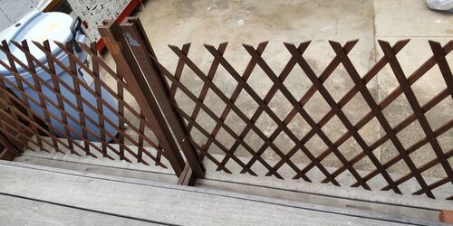 「庭をなんとかしなきゃ・・・」 その前に ウッドデッキが「朽ちかけそう~」と腰を上げるまだまだ前のことですが、 ガレージから庭への間仕切りに、通販で4枚セットを購入しました。 セラガンバツー製、3枚でピッタリでした。 サイズは 1200x900 …