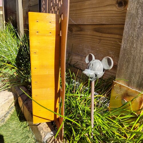 「端材で何か作れないかな~」と思い立った、道標。 4枚とも厚み幅等バラバラで、隠れミッキーが3枚の板に潜んでいます。 こちらは「室外機カバーのA」に取り付け。 ~ここからはステンシル~ A 風が強いと蓋が飛ぶので重石に石をペイントしました。 デコ…