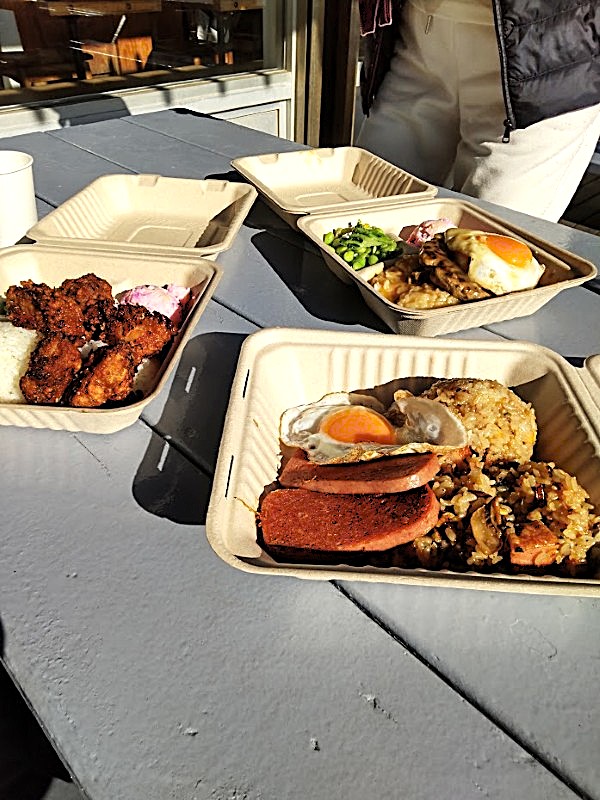 ブランチなのでしっかりと、パシフィックガーリックフライドライスwithソーセージミート、ロコモコプレート、モチコチキンプレートを注文
